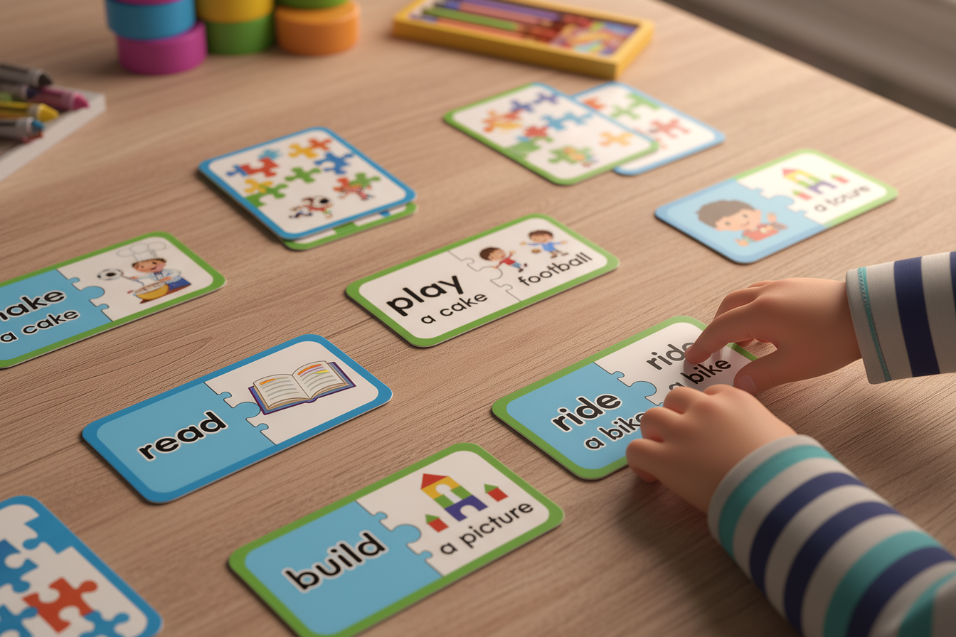 • Match & Speak: Potriviți cardurile „verb x substantiv” și lăsați copilul să spună propoziția cu voce tare.