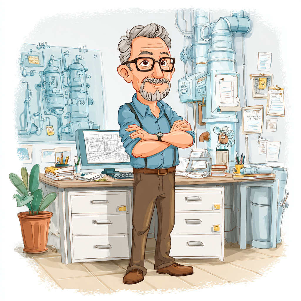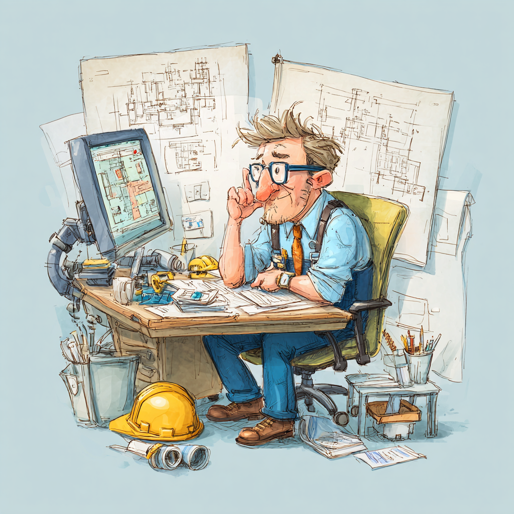 (El este inginer, iar inginerul lucrează într-un birou.)