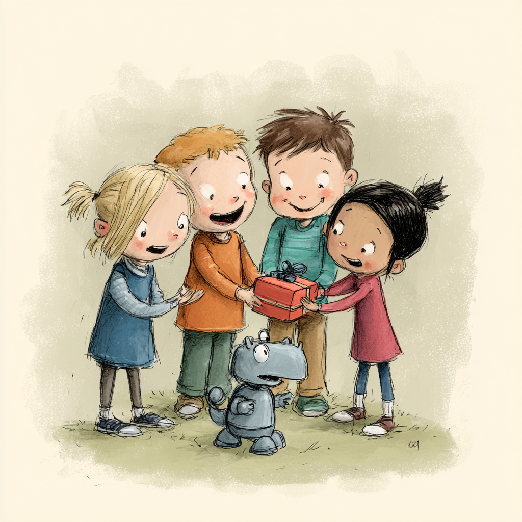 (Copiii sunt fericiți datorită unei jucării noi.)