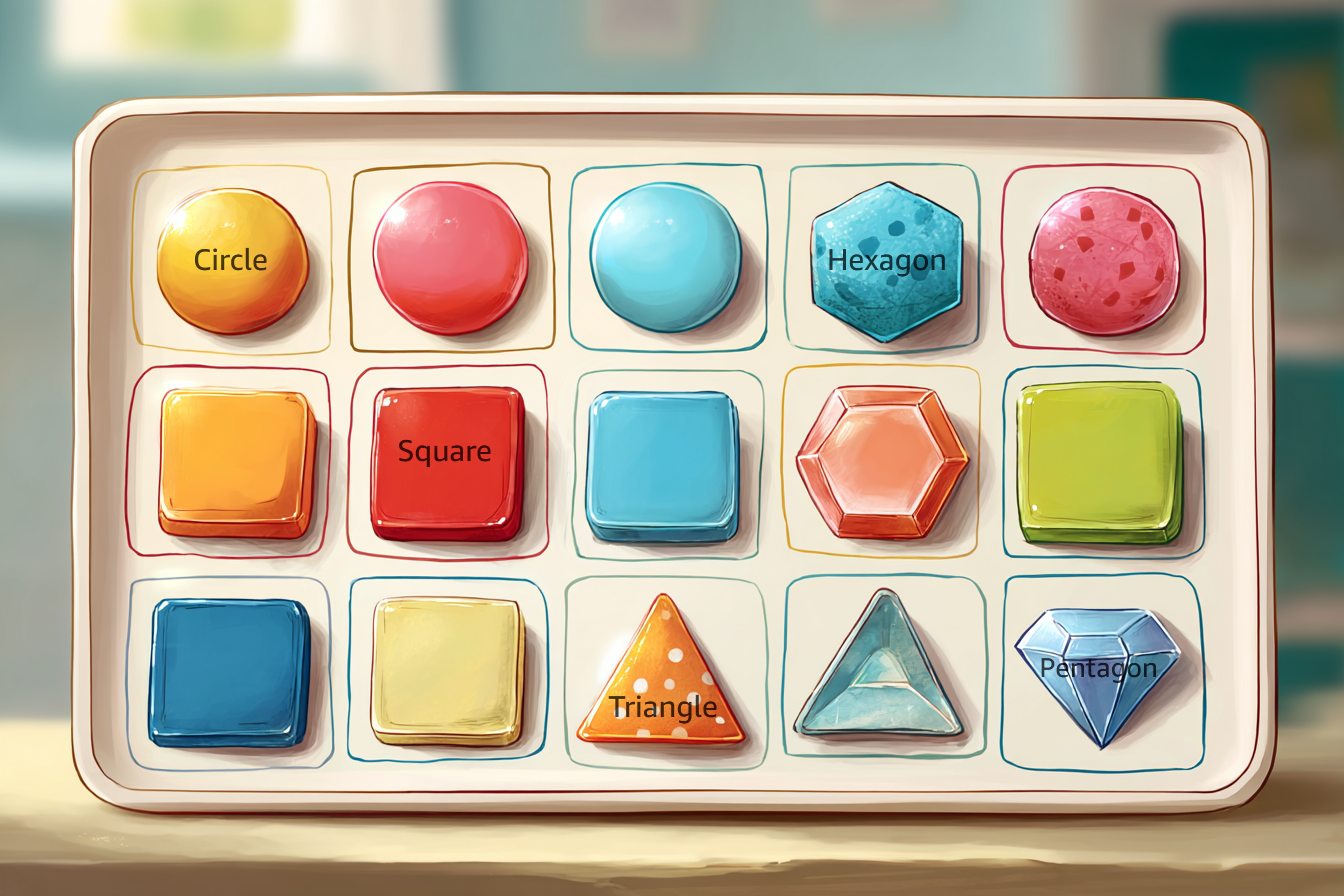 - Asocierea cu obiecte din viața reală – Farfuria (circle), cubul Rubik (cube) sau ecranul telefonului (rectangle) sunt exemple simple pentru copii.