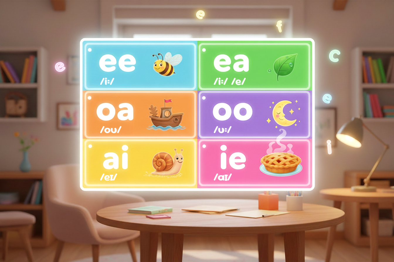 Alege 2-3 cuvinte pentru fiecare combinație și lipește-le pe frigider sau pe o planșă vizuală pentru ca cel mic să le vadă. În fiecare dimineață, repetați împreună cum se pronunță aceste digrafe și inventați propoziții amuzante, cum ar fi: „The fat phone sings a song.” Astfel, copilul învață fonetică și fonologie engleză într-un mod practic și distractiv.