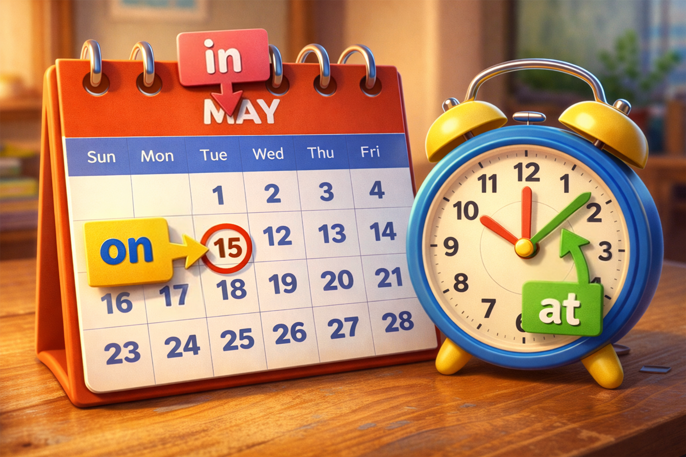 Mini-activitate: Ia un calendar și un ceas. Arată o dată, o zi a săptămânii, o lună sau o oră și întreabă copilul ce prepoziție folosește: in, on sau at.