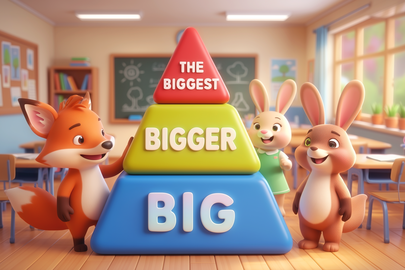 Mini-activitate: Desenați pe o foaie trei trepte și scrieți pe treapta de jos un adjectiv simplu, de exemplu big. Pe a doua treaptă adjectivul la comparativ – bigger. Pe cea de sus – adjectivul la superlativ – the biggest.