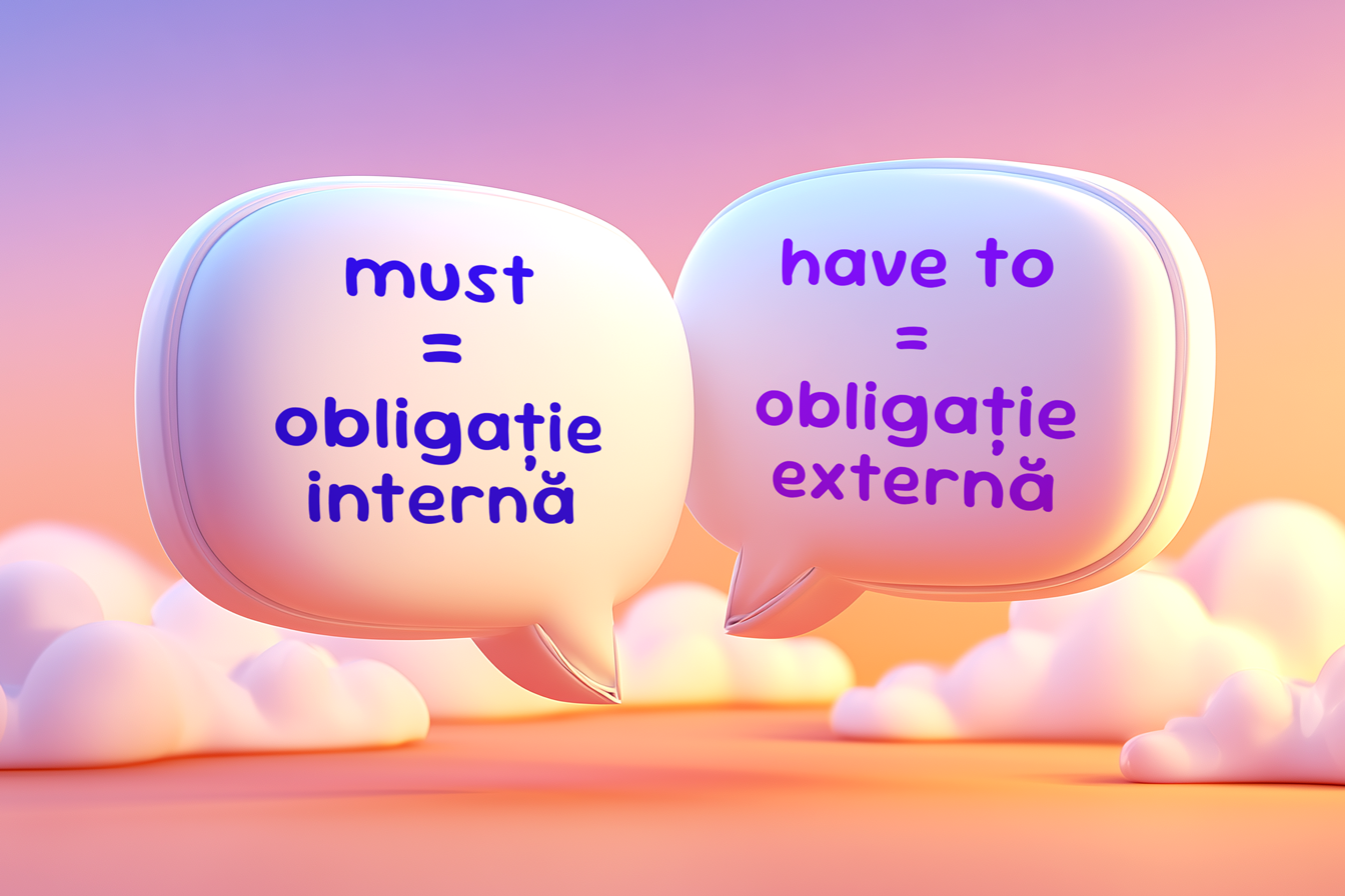 De obicei, copiii și adulții care studiază limba engleza confundă cel mai des verbul „must” și „have to”. Explică celui mic că principala diferență este că must engleza = obligație internă / regulă importantă; have to = obligație venită din exterior (părinte, profesor).