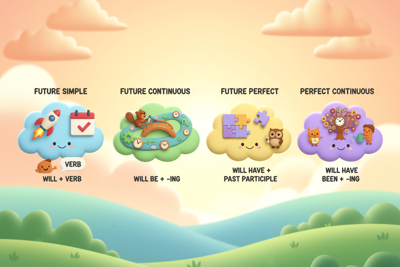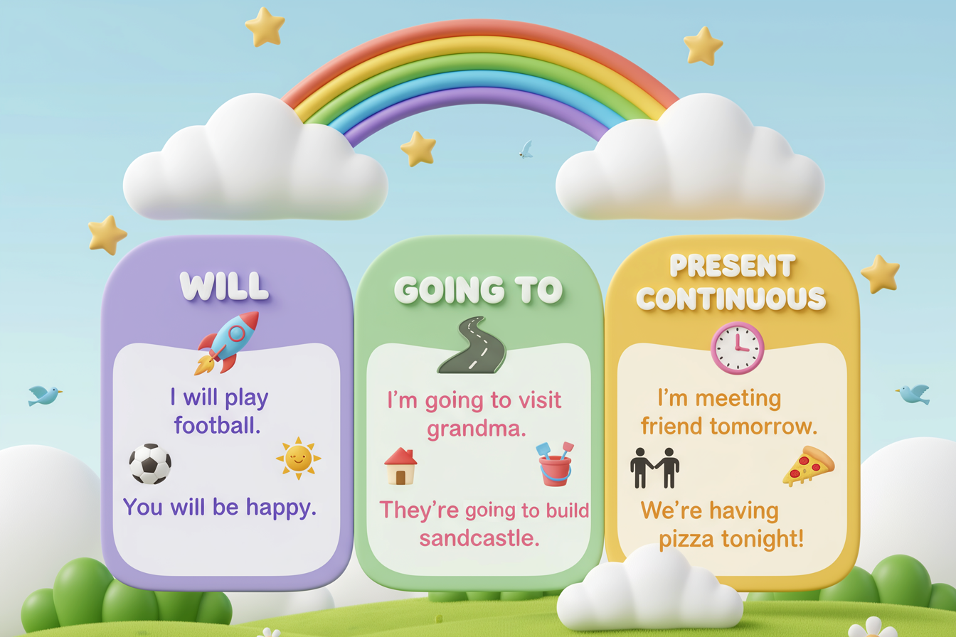 Acest ghid explică cele mai importante forme pentru copii, cu exemple simple, exerciții scurte și trucuri care îi ajută să folosească viitorul corect și natural în engleză.